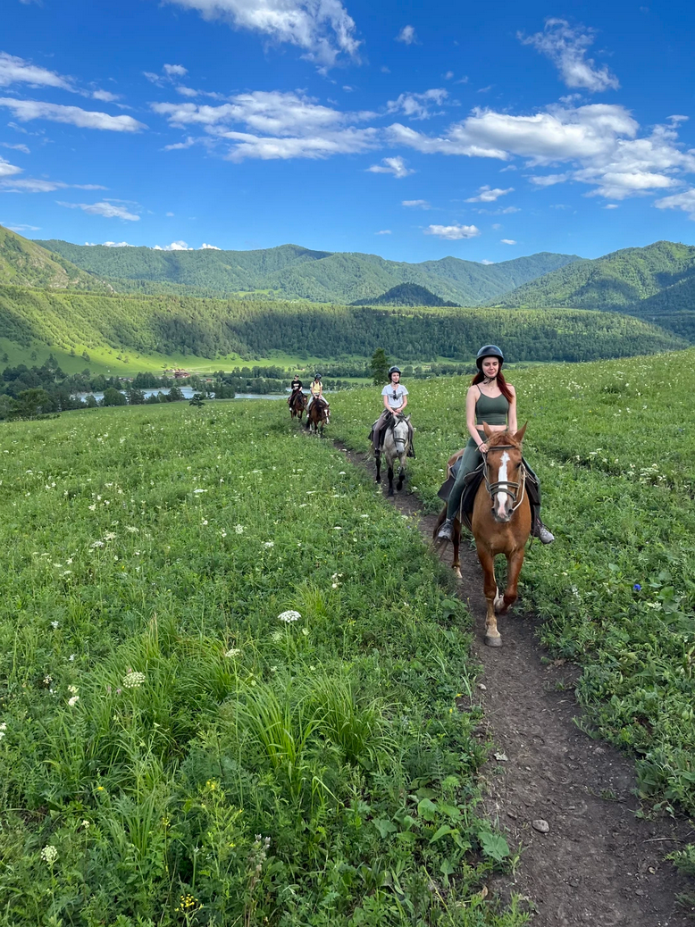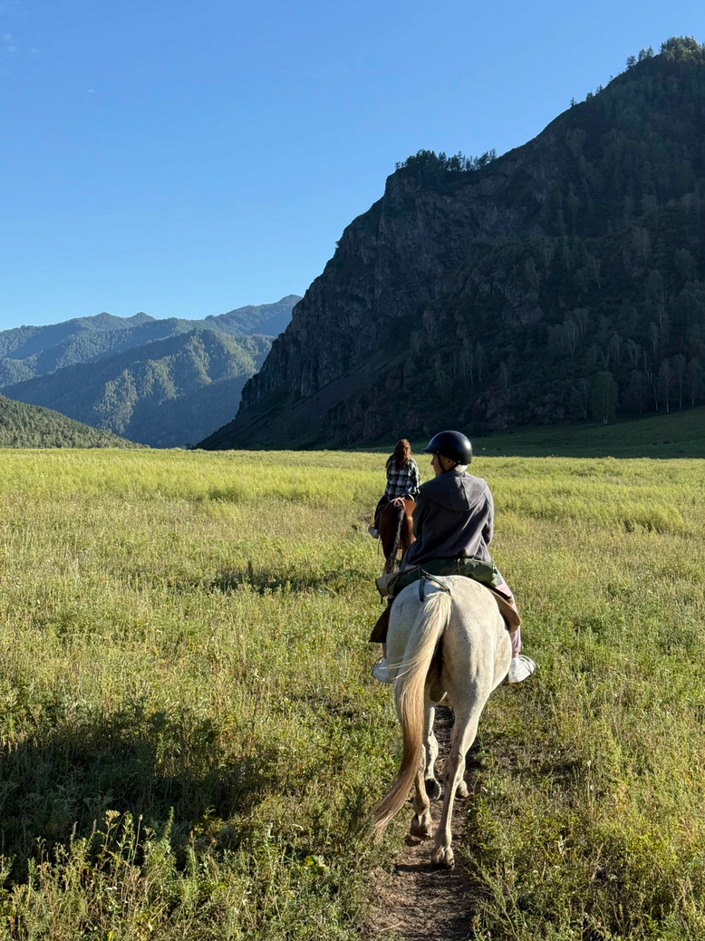 Тропа проведет вас прямо до подъема на смотровое поле рядом со скалистой горой Кресло Сартакпая. Далее вы спуститесь к живописнейшему берегу Катуни на дикий песчаный пляж. При желании, вы можете там пофотографироваться без спешивания. Затем возвращаемся на базу.