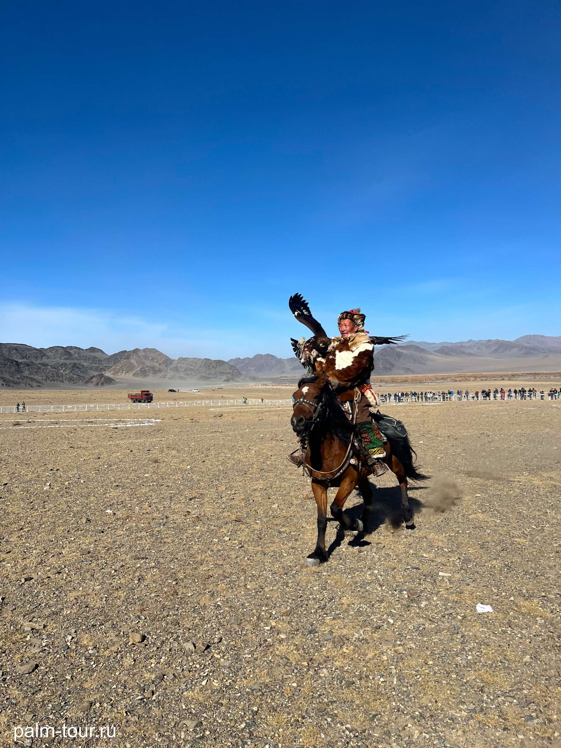 После завтрака мы отправимся на фестиваль, который проходит примерно в 30 минутах езды от Ульгия. День начнется с торжественной церемонии открытия с национальными танцами и песнями. После чего стартует главный конкурс — подзыв орла на руку. Зрелище поистине завораживающее: на высоком холме помощники снимают шапочку с головы беркута и отпускают его в свободный полет. Побеждает тот охотник, чей орёл прилетает быстрее всех.