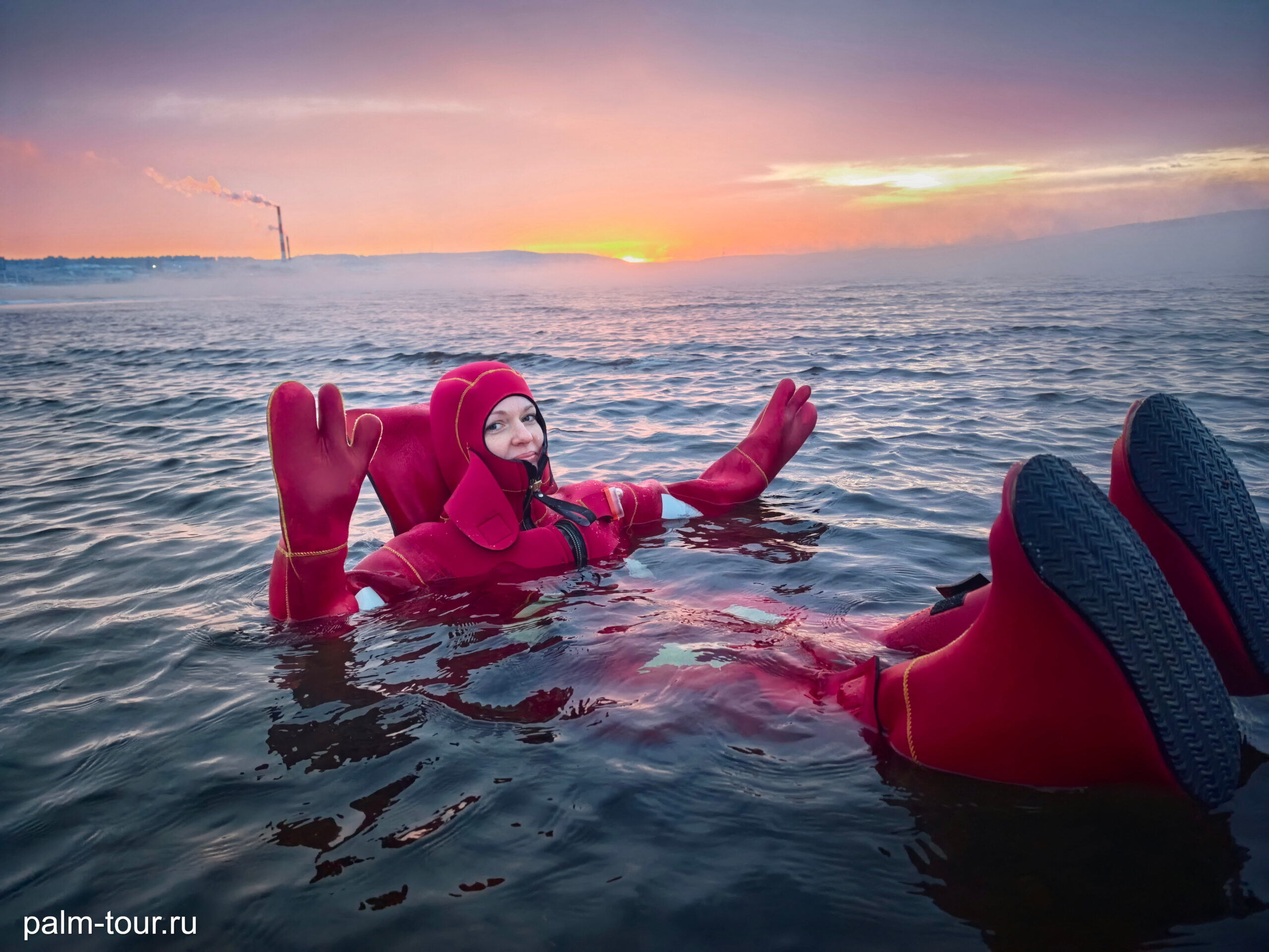 Это невероятная возможность насладиться купанием в ледяной воде, оставаясь при этом в полной безопасности! Купаемся в специальном спасательном костюме, который полностью покрывает тело и обеспечивает надежную защиту от холода.