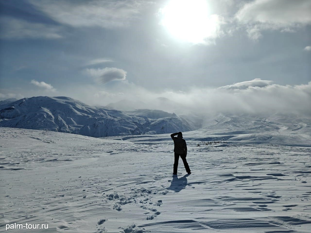 Вариант 1: джип-тур на Лавовую падь. Мы промчимся по твердым снегам в долине сухой реки, будем любоваться горными пейзажами и фотографироваться. Здесь же остановимся на обед, который будет с нами в формате ланч-боксов.