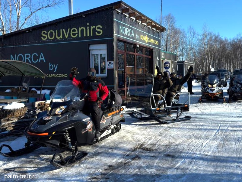 Сперва доедем до точки сбора участников снегоходного тура, далее послушаем технику безопасности, наденем экипировку и отправимся в путь!