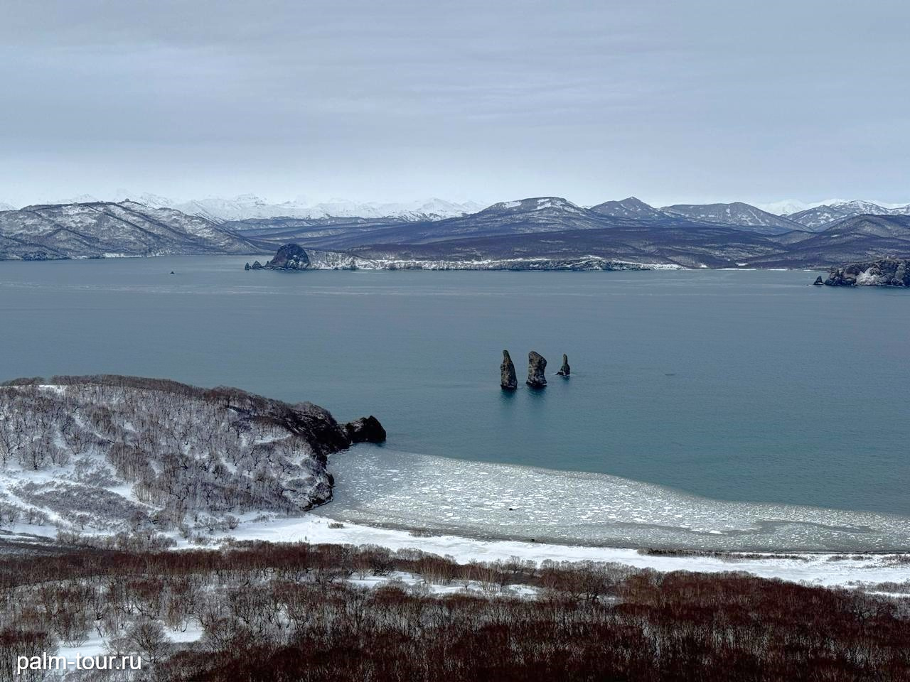 По пути к мысу Маячный задержимся у смотровой с видом на кекуры Три брата, бухты Большая и Малая Лагерная. Три брата – это группа из трех базальтовых скал, выступающих из воды в форме столбов, одни из символов Камчатки.